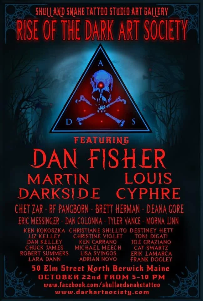 “The First Official Dark Art Society Members Group Show, at Skull and Snake Tattoo Studio Art Gallery , October 22nd from 5-10PM! The intention of the Dark Art Society, created by Chet Zar, is to provide valuable information to artists and collectors alike, with a focus on the many benefits of Dark Art in our modern world. With the belief that by sharing the society’s many talents, perspectives, ideas and resources, together we will raise the overall awareness of Dark Art in contemporary culture, while simultaneously empowering, inspiring and equipping artists to express themselves effectively and efficiently! This show represents a physical manifestation of those words. Please join us for an amazing display of artwork by more than 80 talented Dark Artists from around the world. Live ambient music provided by a mysterious fiddle player, food, place to socialize on the side yard, multiple propane fire pits, good vibes, raffles, Dark Art!”